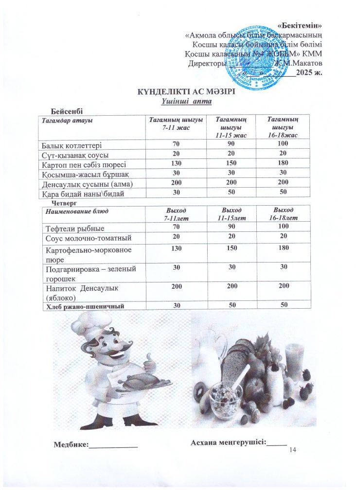 18 желтоқан (сәрсенбі) ас мәзірі