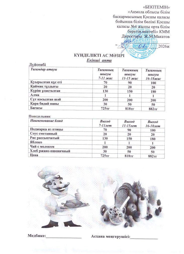 12 қаңтар (дүйсенбі) ас мәзірі