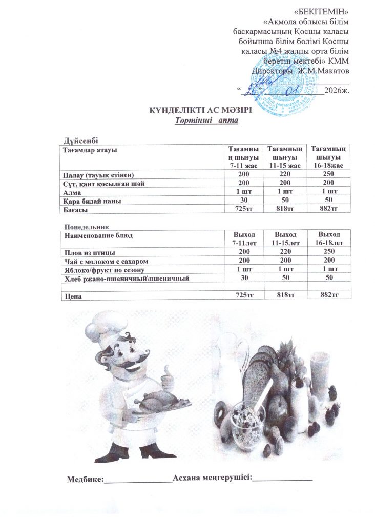 26 қаңтар (дүйсенбі) ас мәзірі